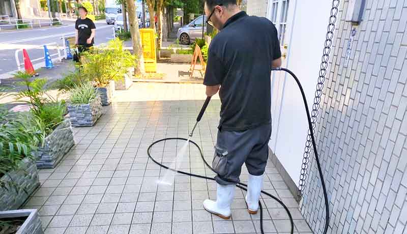 - ポリッシャーや高圧洗浄機などを使って、マンションの共用部や店舗内、施設内の清掃